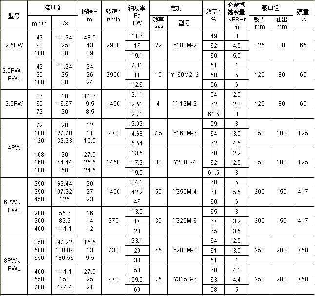 PW型污水泵為臥式、單級、單吸懸壁式離心污水泵,PWL型泵為立式單級、單吸離心式污水泵。適用于輸送80以下帶有纖維或其它懸浮物的液體,供城市、工礦企業(yè)排除污水、糞便之用。